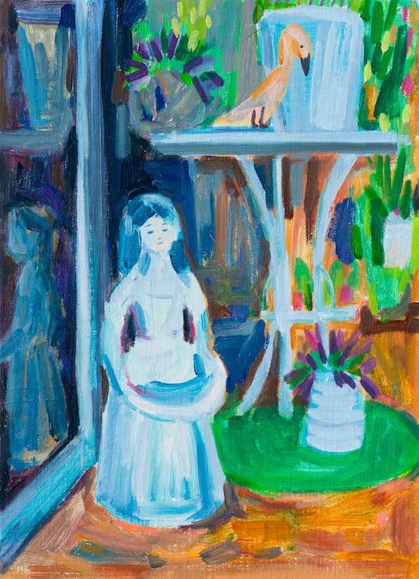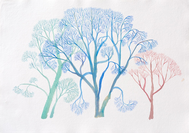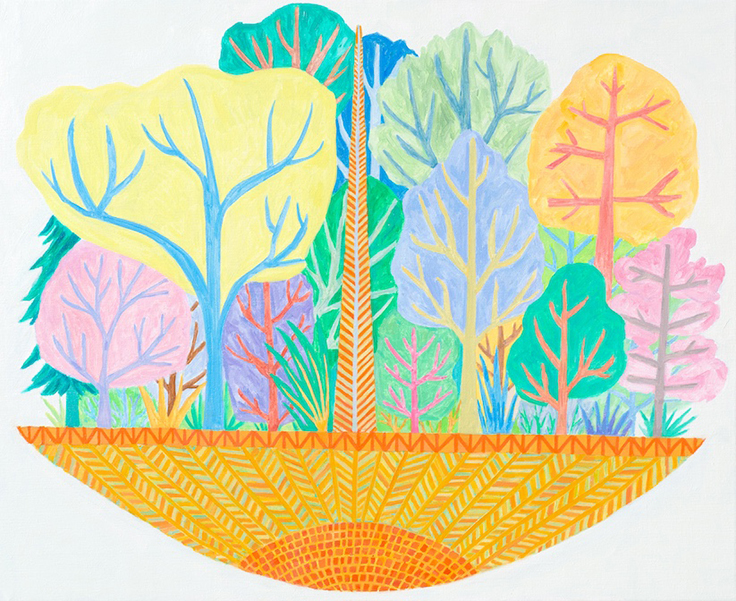 佐々木愛は、様々な国や地域での滞在を通じ、その土地で語り継がれてきた神話、伝承や物語と、彼女が目にした風景や動植物との出会いから着想を得て、ドローイング、油画、木彫、そして粉砂糖を用いた製菓の装飾技術であるロイヤルアイシングによる壁画と、多岐に渡る技術と手法により制作してきました。反復する形象や文様を純白の砂糖で描き象る壁画、シンプルなかたちと鮮やかな色彩のドローイングと油画など、彼女は見たものをそのまま写しとるのではなく、一度自身の身体へと取り込み、心象として立ち上がってきたものを描いた彼女の作品は、見る者自身の「記憶」から想起される世界と現実界とが交わる情景となります。