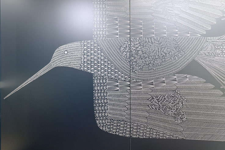 佐々木は「渡りの道しるべ(Wayfinder’s Passage)」と名づけた本展で、日本の最北端に位置する北海道とオーストラリアとを行き来する渡り鳥のオオジシギ(Latham’s Snipe)を主題に、彼女がこれまでに世界各地を巡るなかで描いてきた作品、過去のオーストラリア滞在の記憶やイメージを辿り制作した新作、そしてTHE JAPAN FOUNDATION GALLERYの窓全面に描く壁画によって、日本とオーストラリアを繋ぐ物語を新たに創造します。